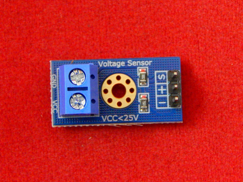 Модуль основан на резистивном делителе напряжения: входное напряжение на клеммнике уменьшается в 5 раз, поэтому при работе с АЦП 5 В допускается измерять до 25 В; с АЦП 3,3 В — до 16,5 В. Благодаря 10-битному АЦП типичных Arduino (1023 шагов) и опорному 5 В, шаг кванта ≈ 0,00489 В, что даёт порог измерения ≈ 0,02445 В после делителя. Выход «S» — аналоговый сигнал, пропорциональный входному напряжению/5; «+» — питание 5 В/3,3 В логической части (если требуется), «–» — GND.
