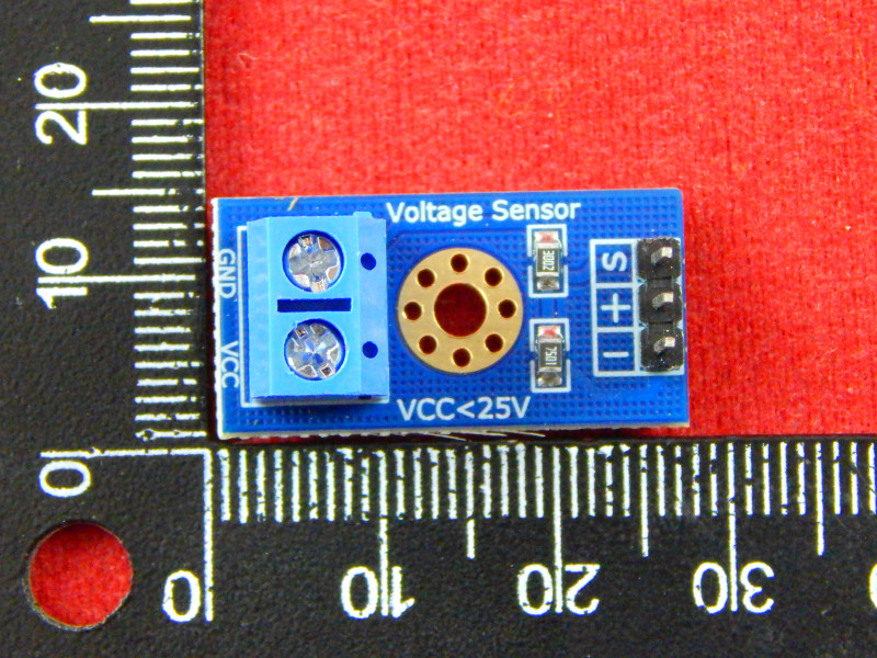 Компактный модуль измеряет постоянное напряжение 0…25 В, понижая его в 5 раз до уровня, безопасного для АЦП микроконтроллеров (5 В/3,3 В). Минимально детектируемое напряжение ~0,02445 В (при 10-бит АЦП и опорном 5 В). Подключение: клеммник VCC/GND (измеряемое), гребёнка S/–/+ к МК. Отлично подходит для Arduino, ESP32/ESP8266, STM32 и др.