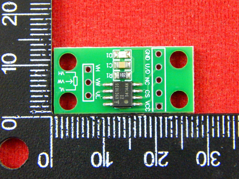 Модуль цифрового потенциометра на чипе X9C103S (до 10кОм). Модуль может запоминать последнее значение сопротивления в EEPROM.